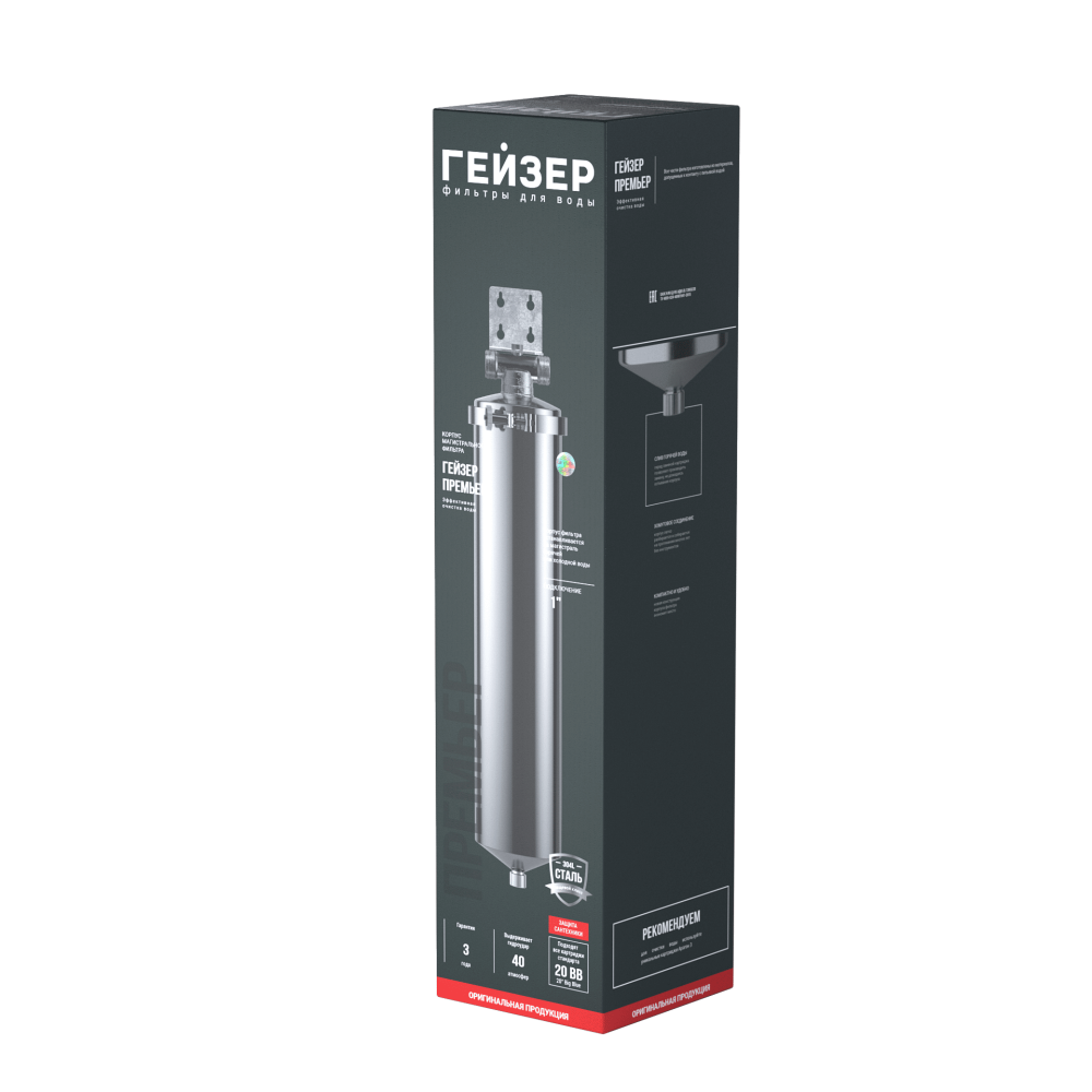 Гейзер-Премьер 20BB 1" легко подключается к магистрали и легко обслуживается. Хомутовое крепление крышки позволяет легко извлечь картридж без использования дополнительных ключей. Также для замены картриджа предусмотрено удобное отверстие для слива воды.