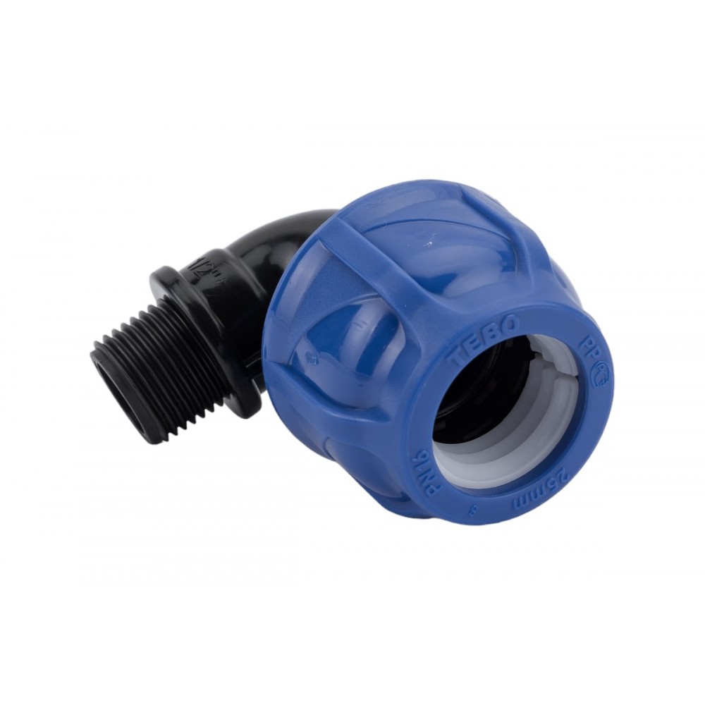 Компрессионный отвод TEBO 25 х 1/2" с наружной резьбой позволяет повернуть ПНД трубу диаметром 25 мм на 90 градусов и сразу перейти на резьбовое соединение. Этот фитинг незаменим для прямого подключения к насосам, коллекторам и другому оборудованию с внутренней резьбой в системах холодного водоснабжения.