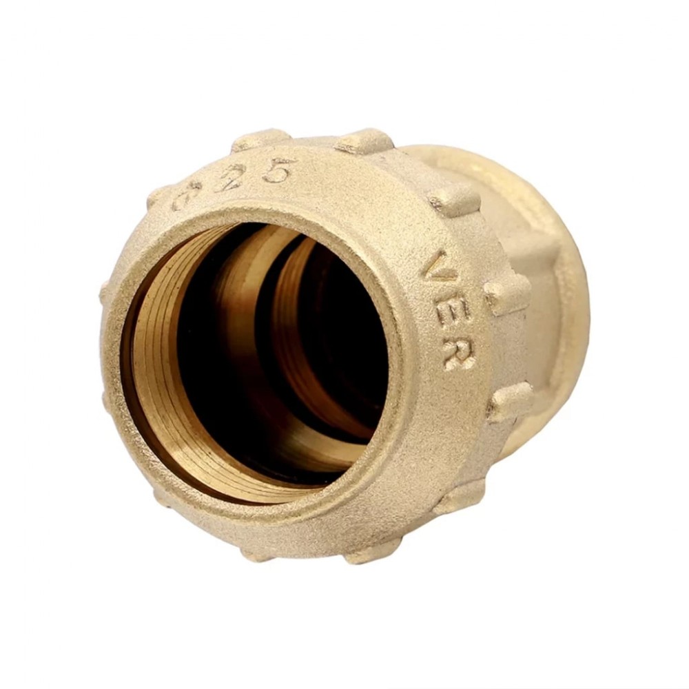 Переходная компрессионная муфта из латуни CW617N предназначена для соединения трубы ПНД диаметром 32 мм с фитингом, имеющим наружную резьбу 1 дюйм. Изделие применяется в системах питьевого и технического водоснабжения. Особенностью является наличие внутренней резьбы для перехода на другой тип соединения.