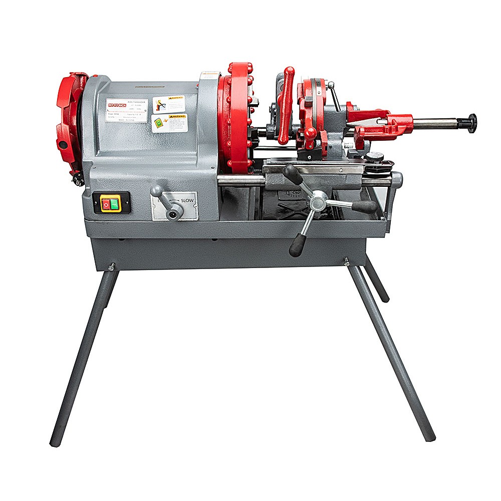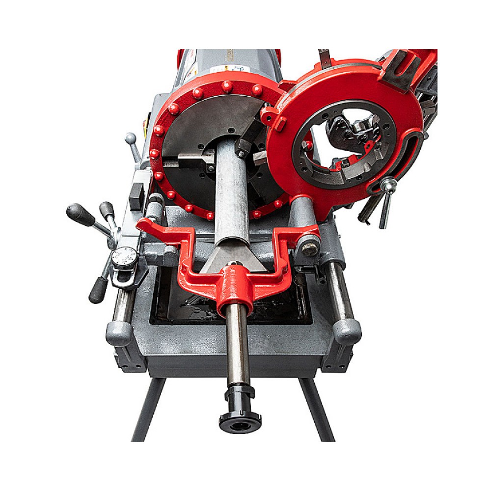 Станок для нарезки резьбы на трубах от 1/2 до 4 дюймов. Мощность 900Вт, 230В. 2 скорости 10 и 25 об/мин. В комплекте 2 головки типа Ridgid, 3 комплекта ножей, труборез, гратосниматель и 4 ножки.