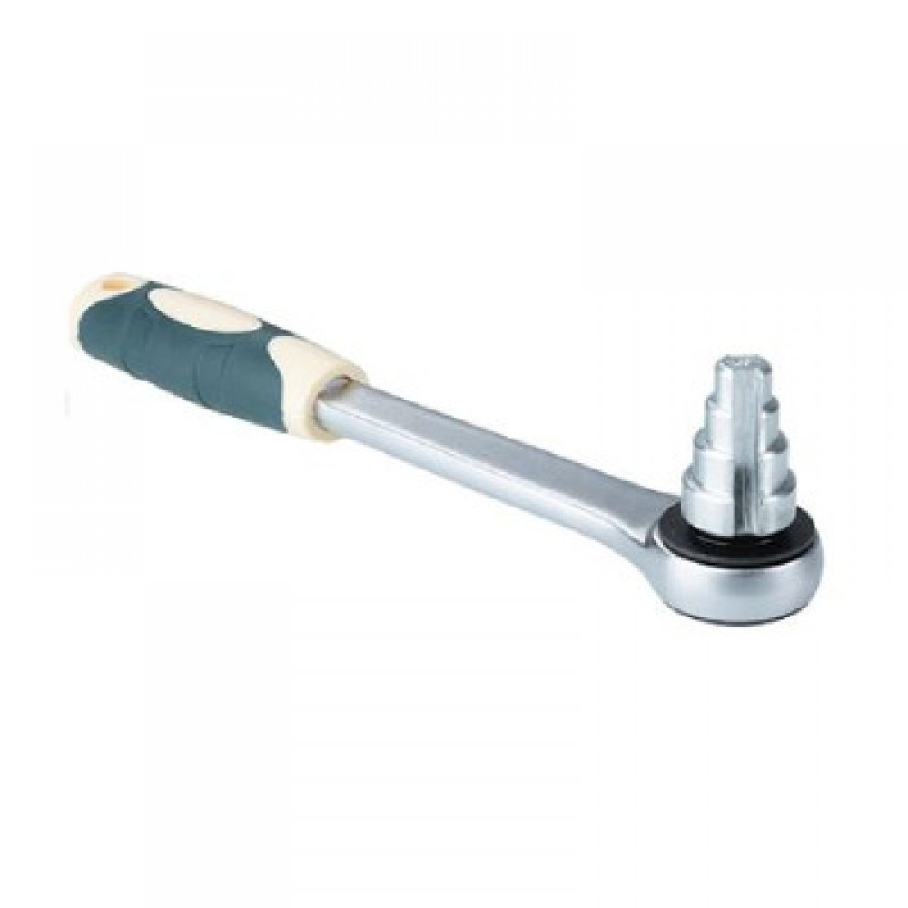 Сгонный ступенчатый ключ для монтажа стальных, чугунных, латунных и бронзовых резьбовых фитингов типа «американка» с монтажными наплывами на внутренней поверхности. Ключ оснащен длинной рукояткой и трещоткой. Диапазон диаметров – от 1/2 до 1 1/4”.