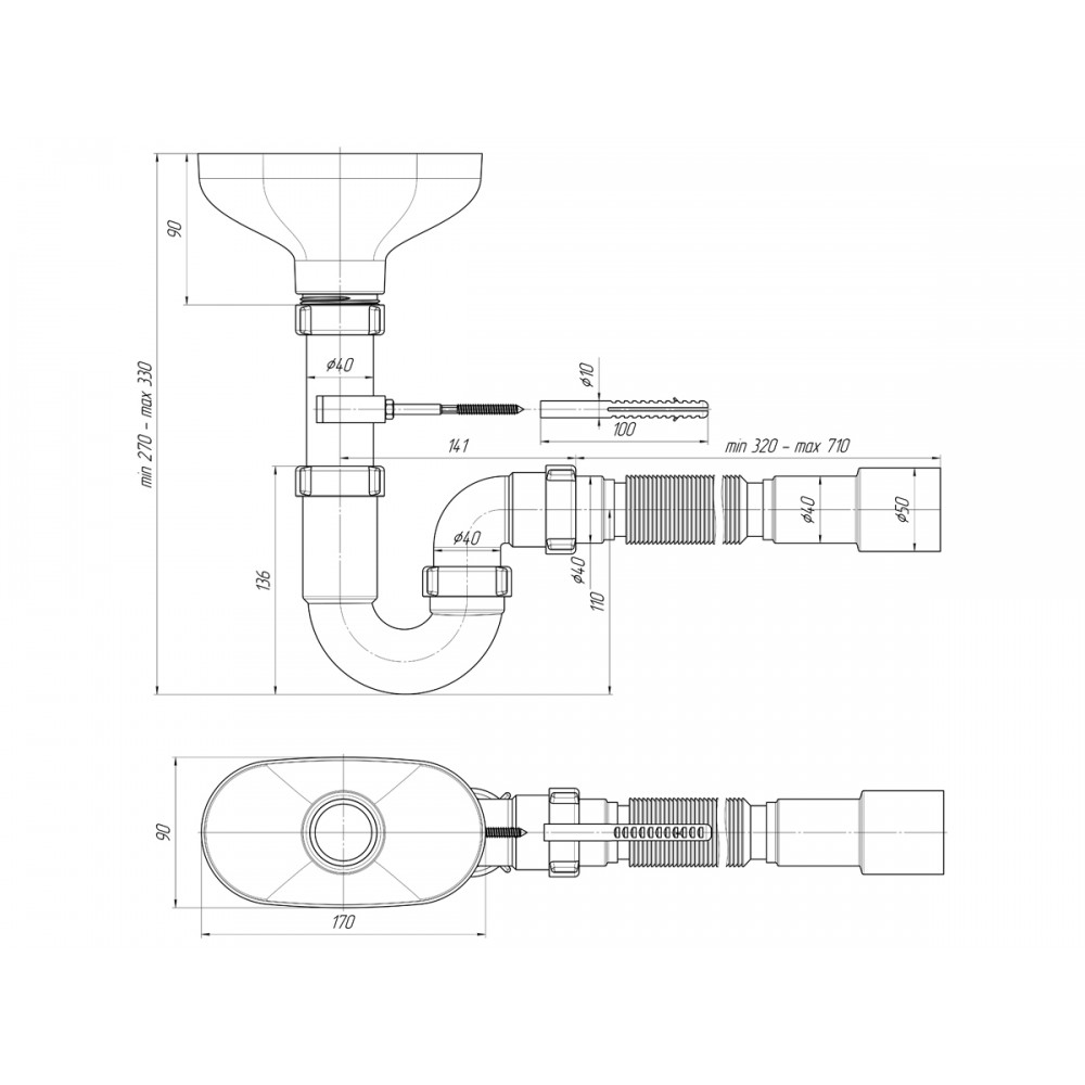 Полное наименование Сифон АНИ 1.1/2"*40 прямоточн. с разрывом струи с гибкой трубой 40*40/50