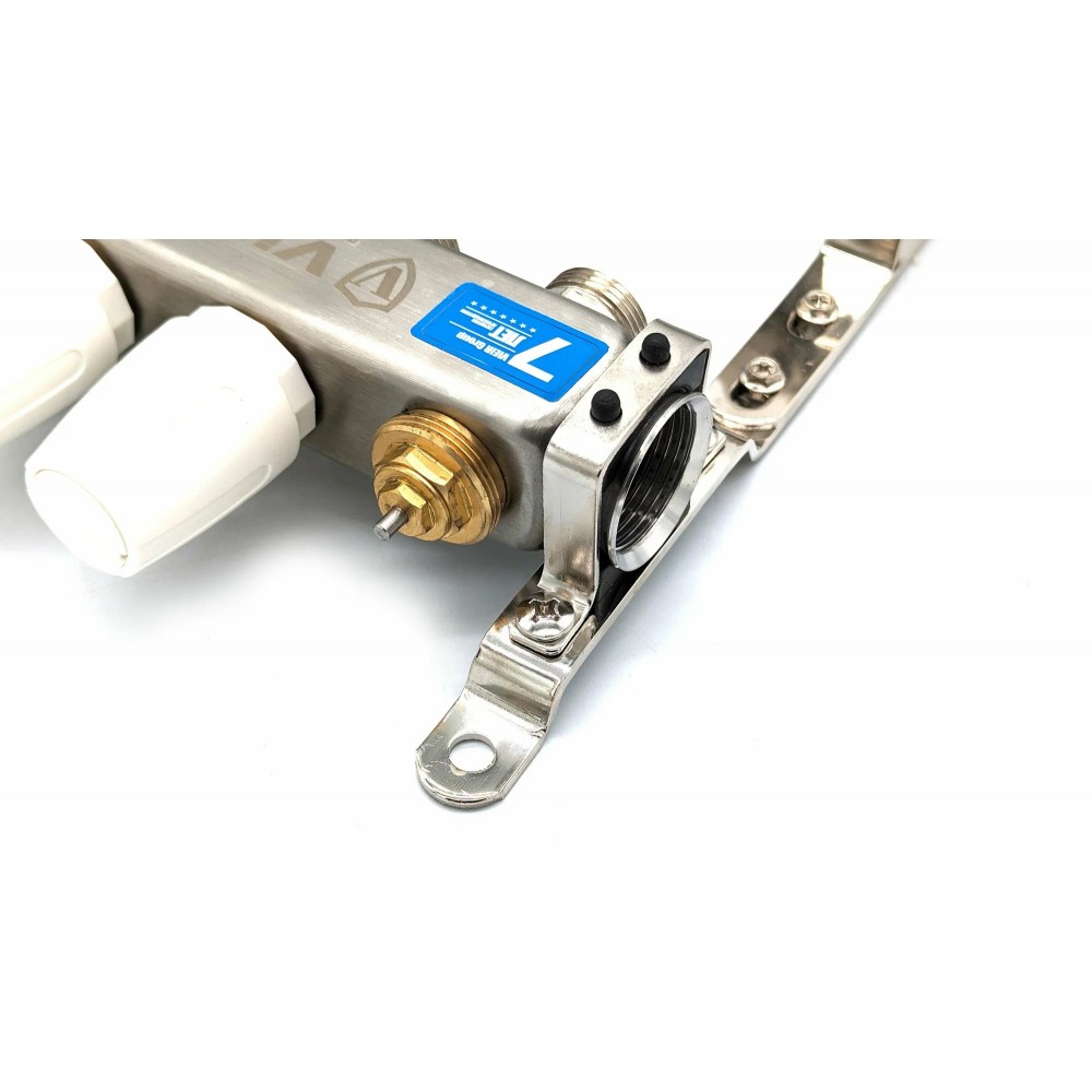 Коллекторная группа VIEIR VR115-11A 1"x3/4", 11 выходов — распределительный коллектор из нержавеющей стали для систем радиаторного отопления и «тёплых полов», рассчитанный на подключение одиннадцати контуров без расходомеров и без шаровых кранов.