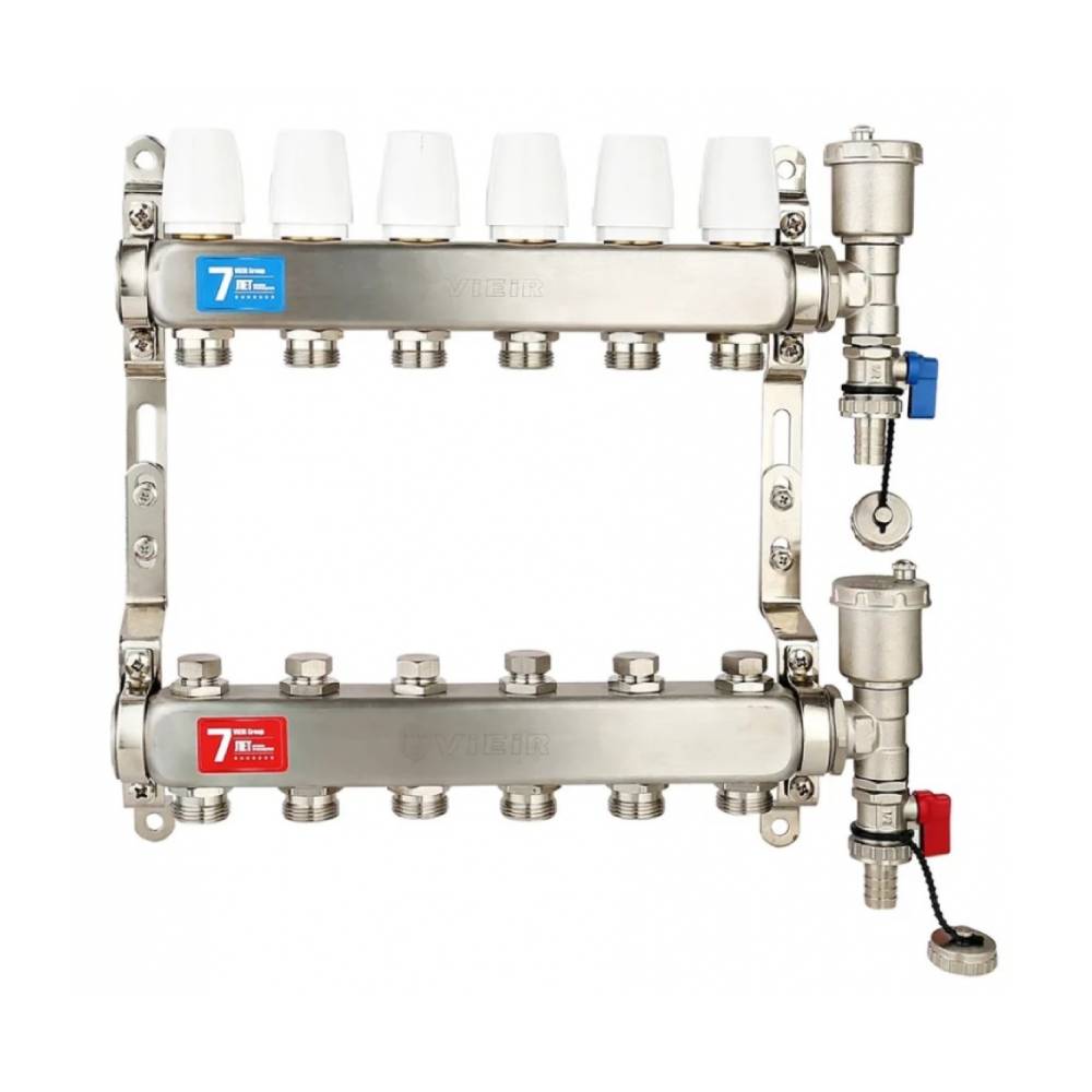 Коллекторная группа VIEIR VR115-06A 1"x3/4", 6 выходов — распределительный коллектор для шести контуров системы «тёплый пол» или радиаторного отопления, выполненный из нержавеющей стали и поставляемый без расходомеров и без кранов.