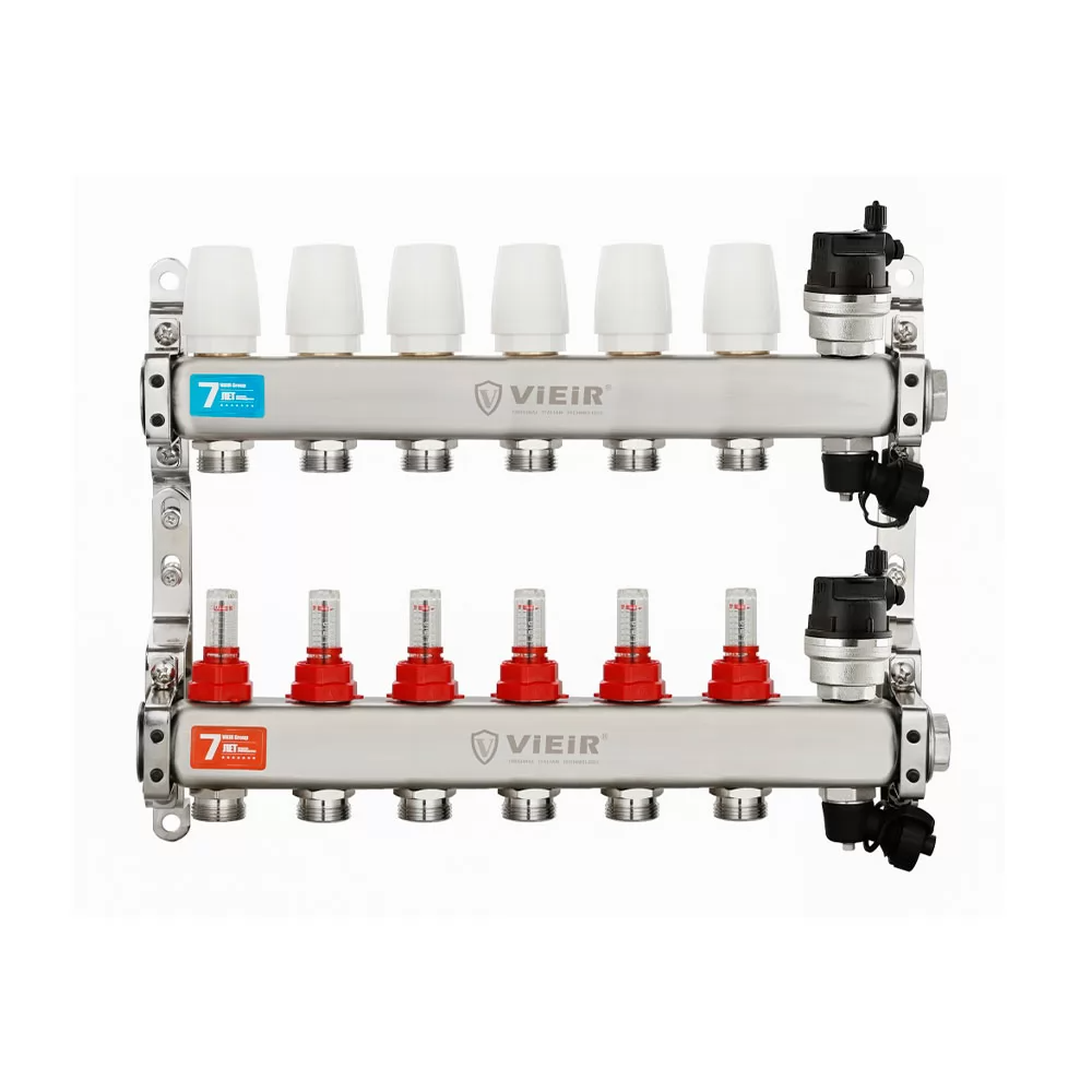 Коллекторная группа VIEIR VR123-06A 1"x3/4", 6 выходов — шестиконтурный коллектор из нержавеющей стали с расходомерами и воздухоотводчиками для низкотемпературных систем отопления и тёплых полов, без шаровых кранов.