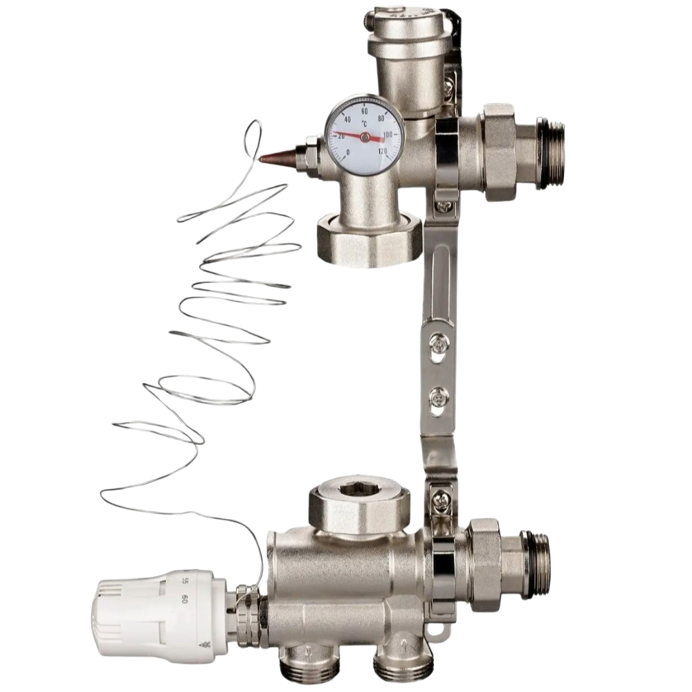 Насосно-смесительный узел предназначен для создания низкотемпературного циркуляционного контура в системах водяного теплого пола. Устройство подготавливает теплоноситель с заданной температурой путем подмеса из обратной линии и подключается непосредственно к коллекторной группе. Ключевая особенность модели — универсальная монтажная планка, позволяющая устанавливать циркуляционные насосы с межосевым расстоянием 130 или 180 мм.