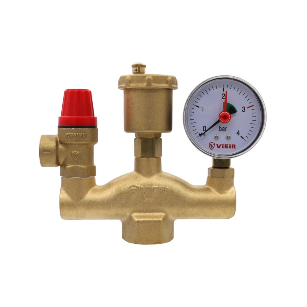 - ✓ Объединяет предохранительный клапан, автоматический поплавковый воздухоотводчик и манометр в одном узле безопасности