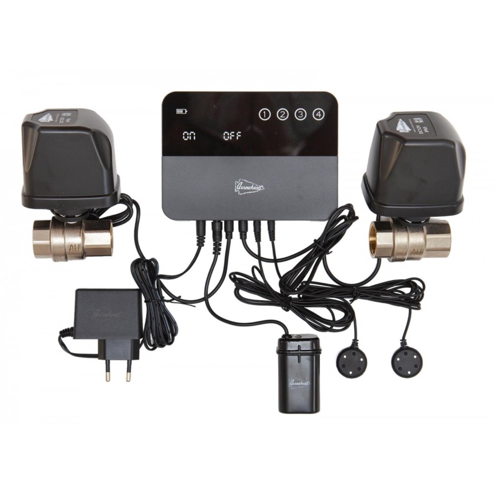Готовый комплект проводной системы Arrowhead для защиты от протечек с электроприводным краном диаметром ½ дюйма. Включает контроллер, сервопривод, два проводных датчика, кабели подключения и адаптер питания.