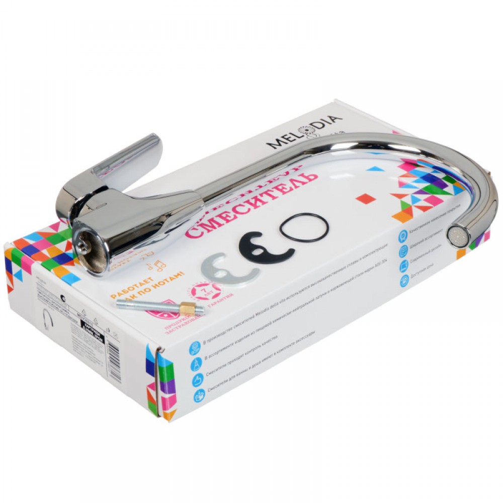 Кухонный смеситель MELODIA Samba MDV30815 представляет собой однорычажную модель с высоким R-образным изливом. Сантехника для кухни оборудована керамическим картриджем 35 мм, который отвечает за точную дозировку воды одним движением руки.