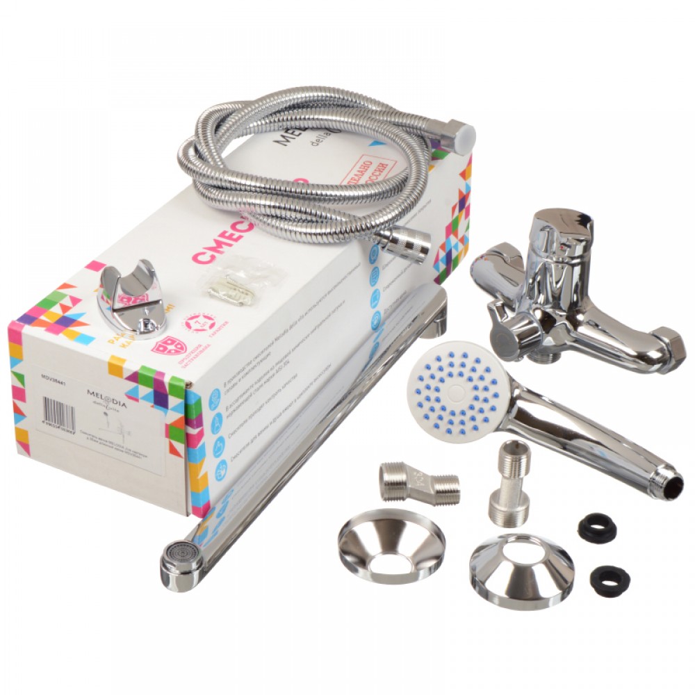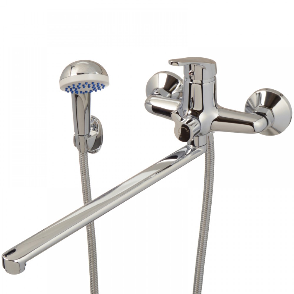 Снаружи смеситель покрыт ровным слоем хрома, защищающим поверхность от потускнения. В комплект поставки входит душевой гарнитур для комфортного проведения водных процедур. Подключение к магистрали выполняется посредством стандартного настенного крепежа.